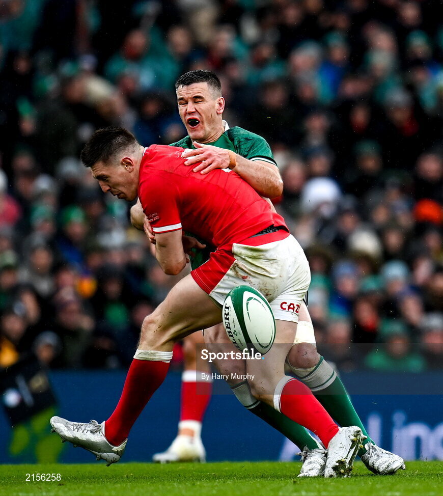 5 February 2022; Jonathan Sexton of Ireland reacts to tackle by Josh Adams of Wales during the Guinness Six Nations Rugby Championship match between Ireland and Wales at the Aviva Stadium in Dublin. Photo by Harry Murphy/Sportsfile