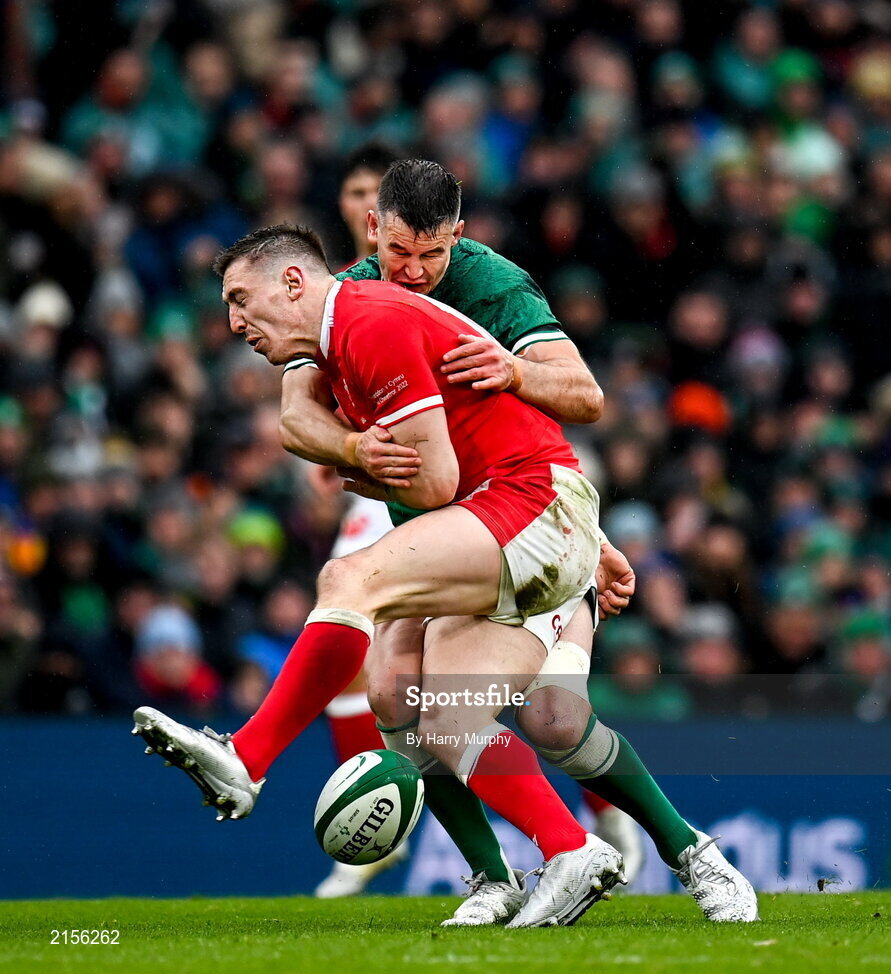 5 February 2022; Josh Adams of Wales tackles Jonathan Sexton of Ireland, resulting in a yellow card, during the Guinness Six Nations Rugby Championship match between Ireland and Wales at the Aviva Stadium in Dublin. Photo by Harry Murphy/Sportsfile