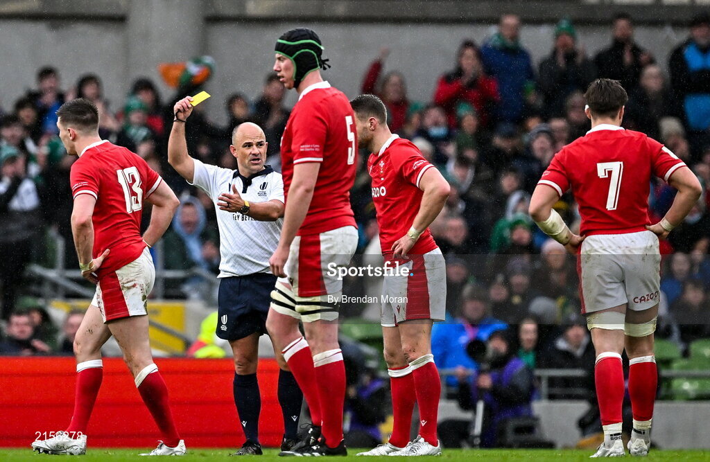 5 February 2022; Referee Jaco Peyper shows a yellow card to Josh Adams of Wales during the Guinness Six Nations Rugby Championship match between Ireland and Wales at the Aviva Stadium in Dublin. Photo by Brendan Moran/Sportsfile