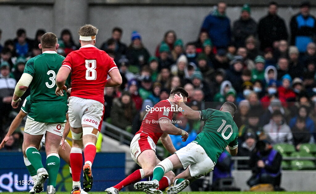 5 February 2022; Jonathan Sexton of Ireland is tackled by Josh Adams of Wales during the Guinness Six Nations Rugby Championship match between Ireland and Wales at the Aviva Stadium in Dublin. Photo by Brendan Moran/Sportsfile