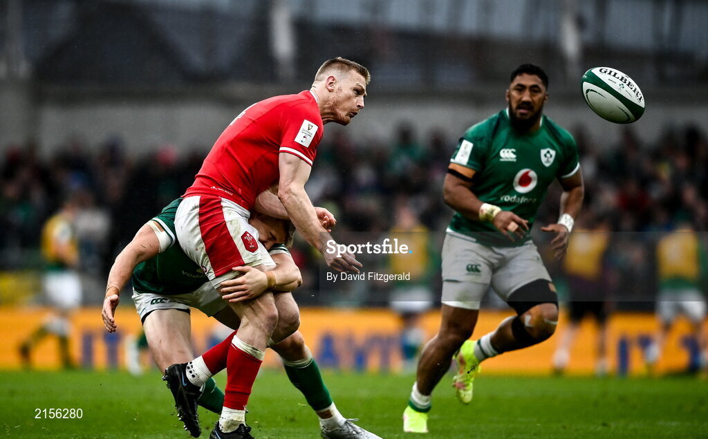 5 February 2022; Johnny McNicholl of Wales is tackled by Garry Ringrose of Ireland during the Guinness Six Nations Rugby Championship match between Ireland and Wales at the Aviva Stadium in Dublin. Photo by David Fitzgerald/Sportsfile