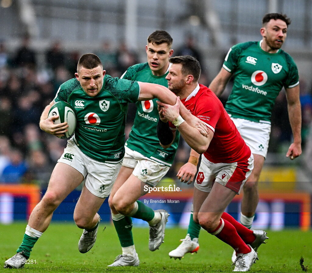 5 February 2022; Andrew Conway of Ireland is tackled by Dan Biggar of Wales during the Guinness Six Nations Rugby Championship match between Ireland and Wales at the Aviva Stadium in Dublin. Photo by Brendan Moran/Sportsfile