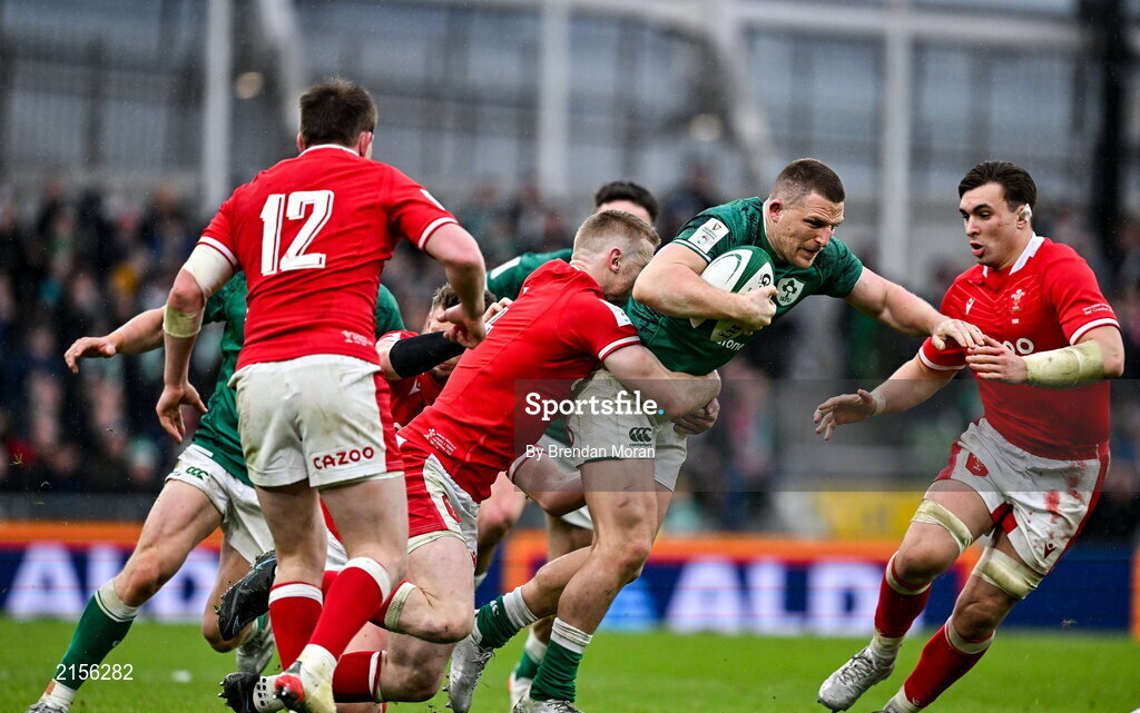 5 February 2022; Andrew Conway of Ireland is tackled by Johnny McNicholl of Wales during the Guinness Six Nations Rugby Championship match between Ireland and Wales at the Aviva Stadium in Dublin. Photo by Brendan Moran/Sportsfile