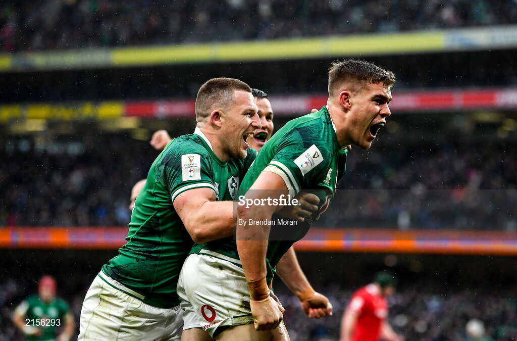 5 February 2022; Garry Ringrose of Ireland, right, is congratulated by teammates Andrew Conway, left, and Jonathan Sexton after scoring his side's fourth try during the Guinness Six Nations Rugby Championship match between Ireland and Wales at the Aviva Stadium in Dublin. Photo by Brendan Moran/Sportsfile