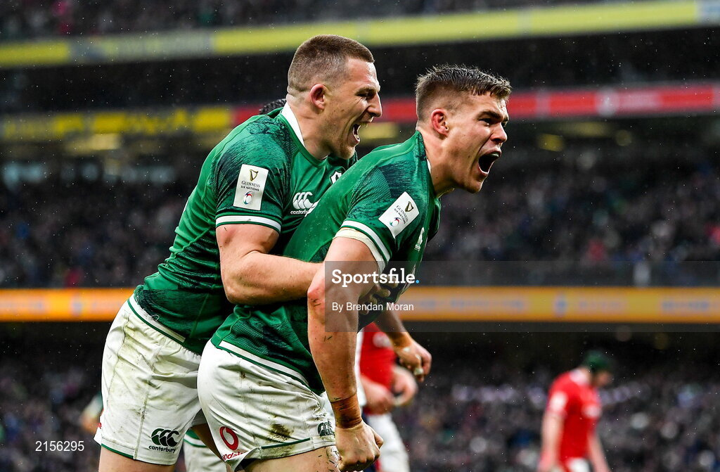 5 February 2022; Garry Ringrose of Ireland, right, is celebrates with teammate Andrew Conway after scoring his side's fourth try during the Guinness Six Nations Rugby Championship match between Ireland and Wales at the Aviva Stadium in Dublin. Photo by Brendan Moran/Sportsfile