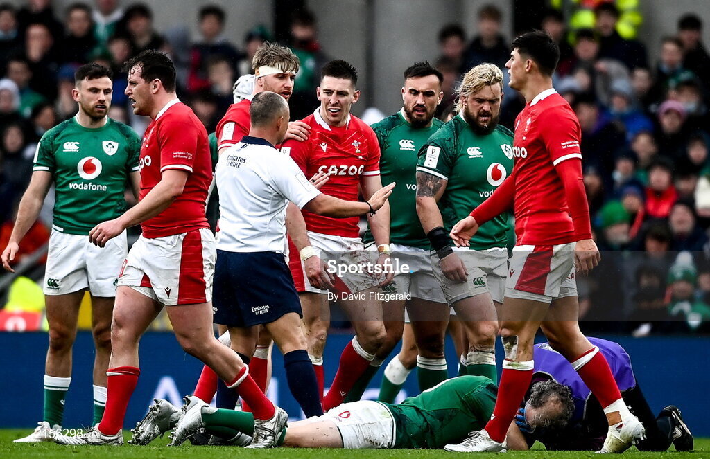 5 February 2022; Referee Jaco Peyper speaks to Josh Adams of Wales as Jonathan Sexton of Ireland receives medical treatment during the Guinness Six Nations Rugby Championship match between Ireland and Wales at the Aviva Stadium in Dublin. Photo by David Fitzgerald/Sportsfile
