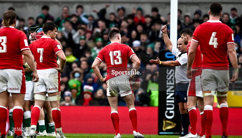 5 February 2022; Referee Jaco Peyper shows Josh Adams of Wales a yellow card during the Guinness Six Nations Rugby Championship match between Ireland and Wales at the Aviva Stadium in Dublin. Photo by David Fitzgerald/Sportsfile