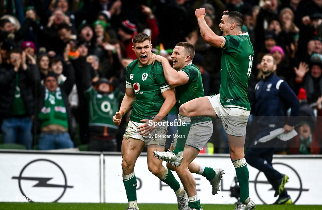 5 February 2022; Garry Ringrose of Ireland, left, celebrates with teammates including, Jonathan Sexton, right, and Andrew Conway, centre, after scoring their side's fourth try during the Guinness Six Nations Rugby Championship match between Ireland and Wales at the Aviva Stadium in Dublin. Photo by Brendan Moran/Sportsfile