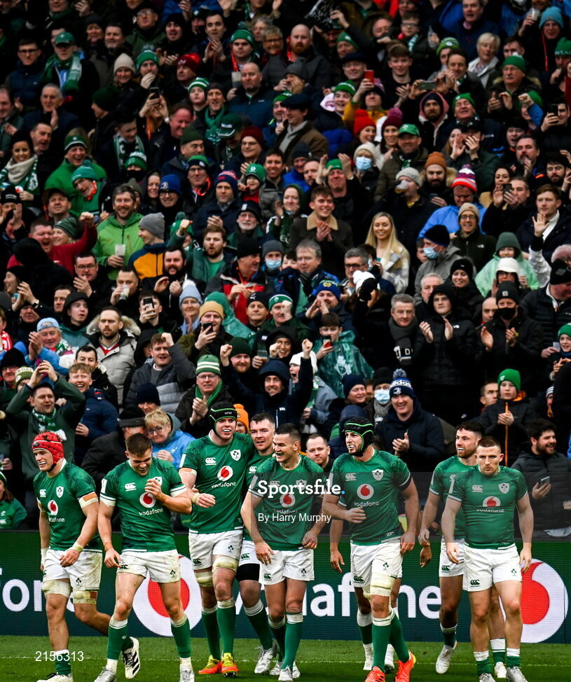 5 February 2022; Garry Ringrose of Ireland, second from left, celebrates with teammates after scoring his side's fourth try during the Guinness Six Nations Rugby Championship match between Ireland and Wales at the Aviva Stadium in Dublin. Photo by Harry Murphy/Sportsfile