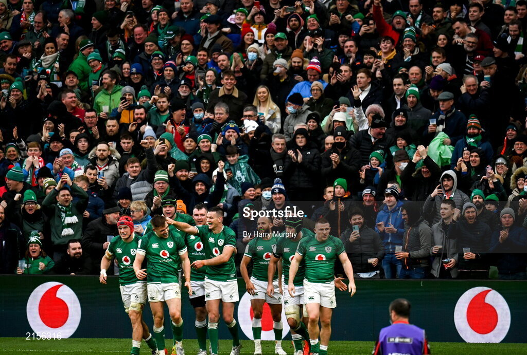 5 February 2022; Garry Ringrose of Ireland, second from left, celebrates with teammates after scoring his side's fourth try during the Guinness Six Nations Rugby Championship match between Ireland and Wales at the Aviva Stadium in Dublin. Photo by Harry Murphy/Sportsfile