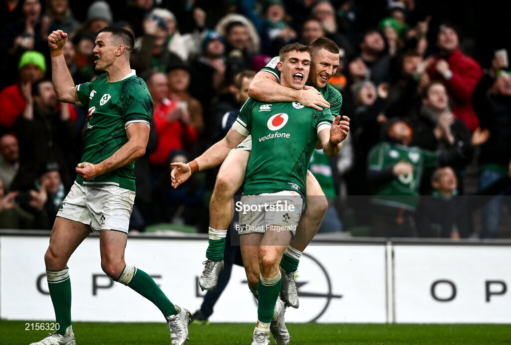 5 February 2022; Garry Ringrose of Ireland, centre, celebrates with teammates Jonathan Sexton, left, and Andrew Conway after scoring his side's fourth try during the Guinness Six Nations Rugby Championship match between Ireland and Wales at the Aviva Stadium in Dublin. Photo by David Fitzgerald/Sportsfile