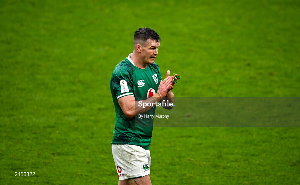 5 February 2022; Jonathan Sexton of Ireland shows appreciation to supporters after being substituted during the Guinness Six Nations Rugby Championship match between Ireland and Wales at the Aviva Stadium in Dublin. Photo by Harry Murphy/Sportsfile