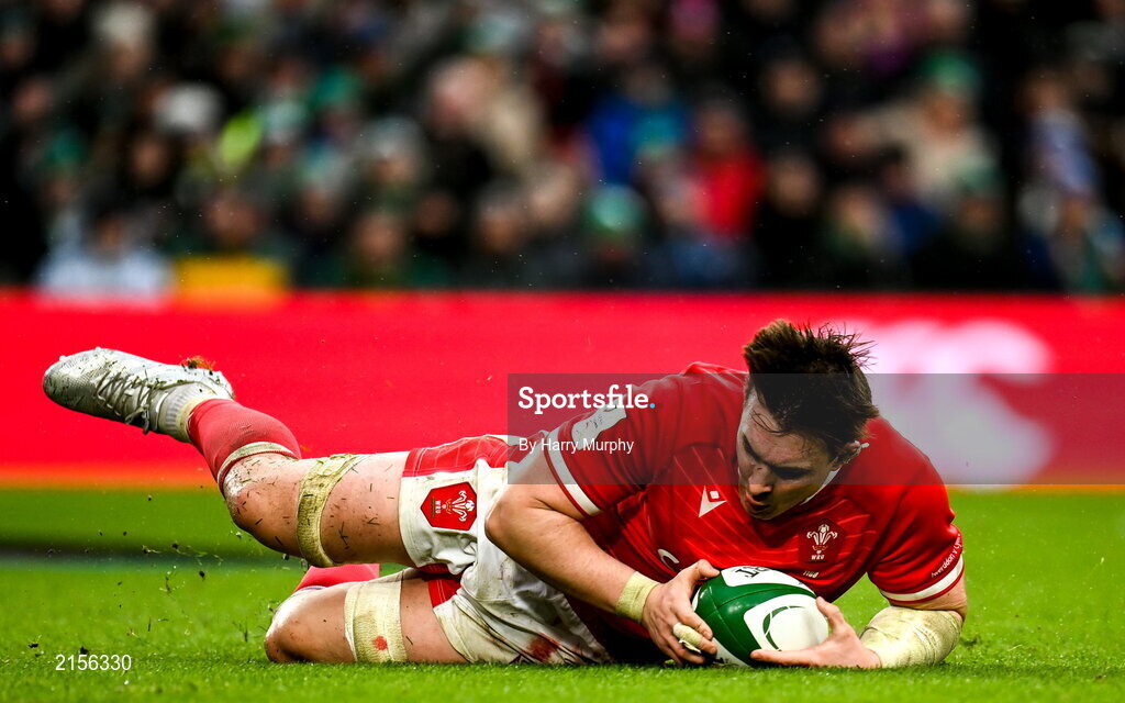 5 February 2022; Taine Basham of Wales scores his side's first try during the Guinness Six Nations Rugby Championship match between Ireland and Wales at the Aviva Stadium in Dublin. Photo by Harry Murphy/Sportsfile