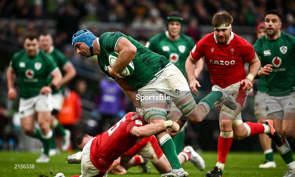 5 February 2022; Tadhg Beirne of Ireland is tackled by Liam Williams of Wales during the Guinness Six Nations Rugby Championship match between Ireland and Wales at the Aviva Stadium in Dublin. Photo by David Fitzgerald/Sportsfile