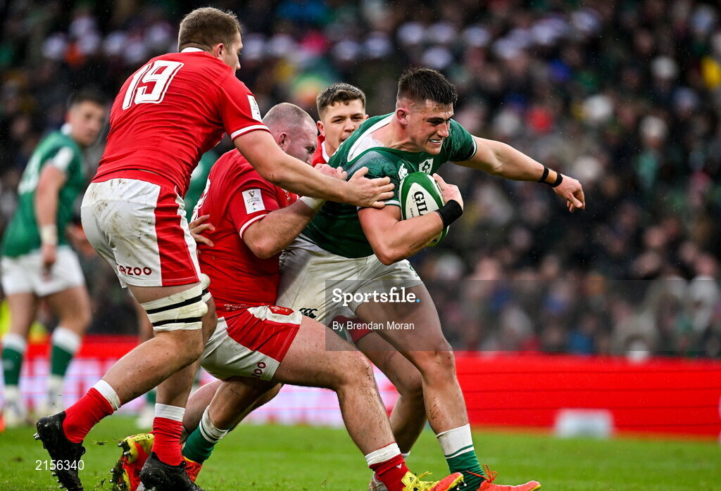 5 February 2022; Dan Sheehan of Ireland is tackled by Dillon Lewis, and Seb Davies, left, of Wales during the Guinness Six Nations Rugby Championship match between Ireland and Wales at the Aviva Stadium in Dublin. Photo by Brendan Moran/Sportsfile