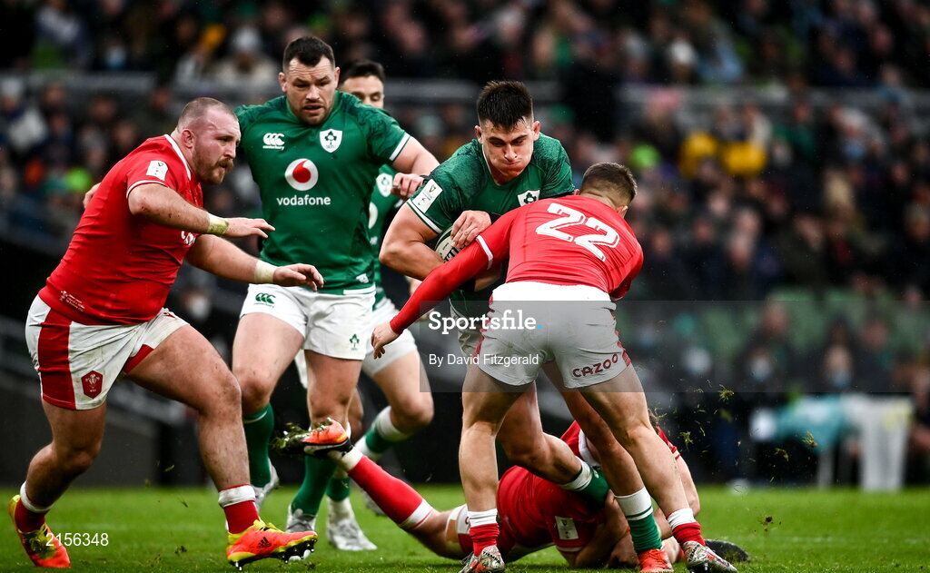 5 February 2022; Dan Sheehan of Ireland is tackled by Callum Sheedy of Wales the Guinness Six Nations Rugby Championship match between Ireland and Wales at the Aviva Stadium in Dublin. Photo by David Fitzgerald/Sportsfile