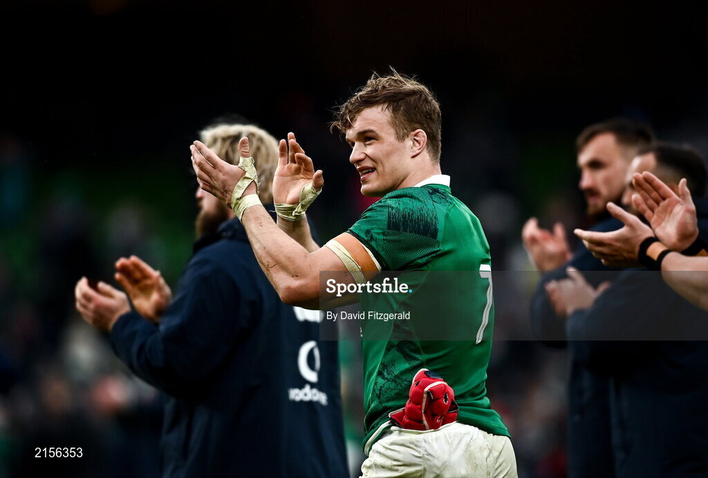 5 February 2022; Josh Van der Flier acknowledges the support after the Guinness Six Nations Rugby Championship match between Ireland and Wales at the Aviva Stadium in Dublin. Photo by David Fitzgerald/Sportsfile