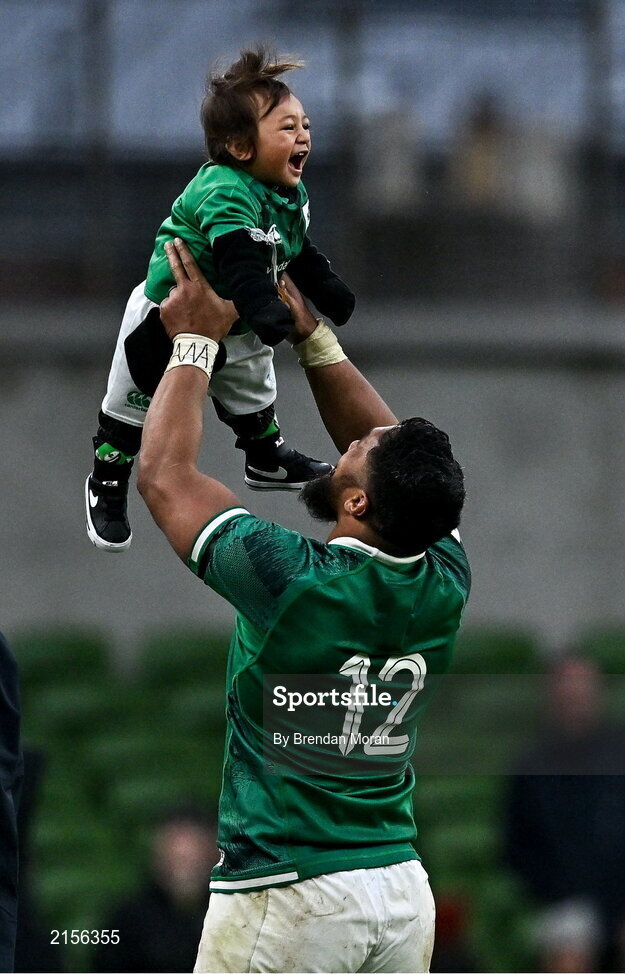 5 February 2022; Bundee Aki of Ireland lifts his one year old son Andronicus Junior Papamau after the Guinness Six Nations Rugby Championship match between Ireland and Wales at the Aviva Stadium in Dublin. Photo by Brendan Moran/Sportsfile