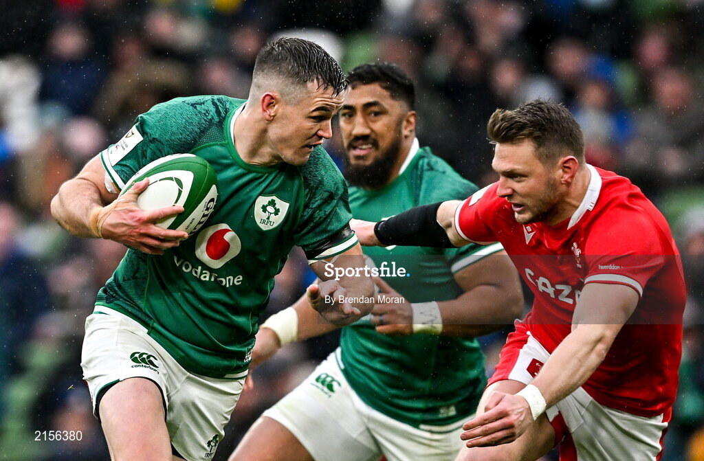 5 February 2022; Jonathan Sexton of Ireland beats the tackle of Dan Biggar of Wales during the Guinness Six Nations Rugby Championship match between Ireland and Wales at the Aviva Stadium in Dublin. Photo by Brendan Moran/Sportsfile