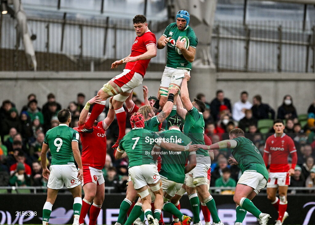 5 February 2022; Tadhg Beirne of Ireland wins possession from a lineout ahead of Will Rowlands of Wales during the Guinness Six Nations Rugby Championship match between Ireland and Wales at the Aviva Stadium in Dublin. Photo by Brendan Moran/Sportsfile