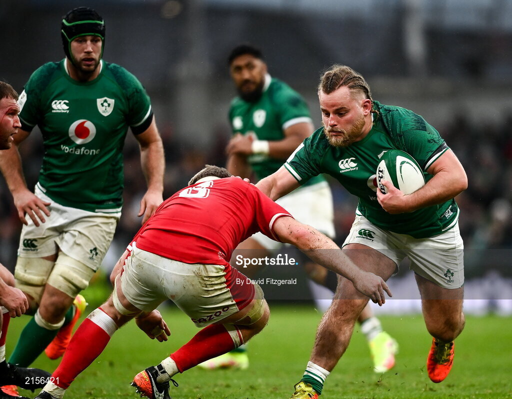 5 February 2022; Finlay Bealham of Ireland is tackled by Aaron Wainwright of Wales during the Guinness Six Nations Rugby Championship match between Ireland and Wales at the Aviva Stadium in Dublin. Photo by David Fitzgerald/Sportsfile