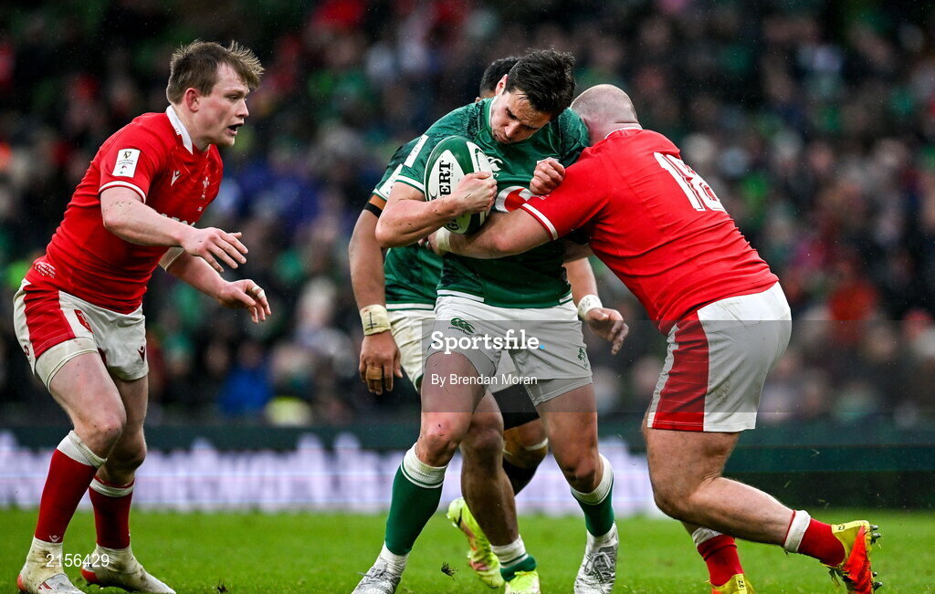5 February 2022; Joey Carbery of Ireland is tackled by Dillon Lewis of Wales during the Guinness Six Nations Rugby Championship match between Ireland and Wales at Aviva Stadium in Dublin. Photo by Brendan Moran/Sportsfile