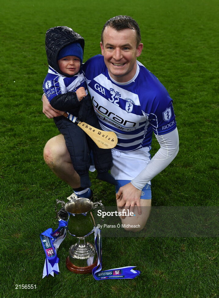 5 February 2022; Naas hurler Shane Walsh celebrates with his son Johne, age 1, after his side's victory in the AIB GAA Hurling All-Ireland Intermediate Club Championship Final match between Kilmoyley, Kerry, and Naas, Kildare, at Croke Park in Dublin. Photo by Piaras Ó Mídheach/Sportsfile