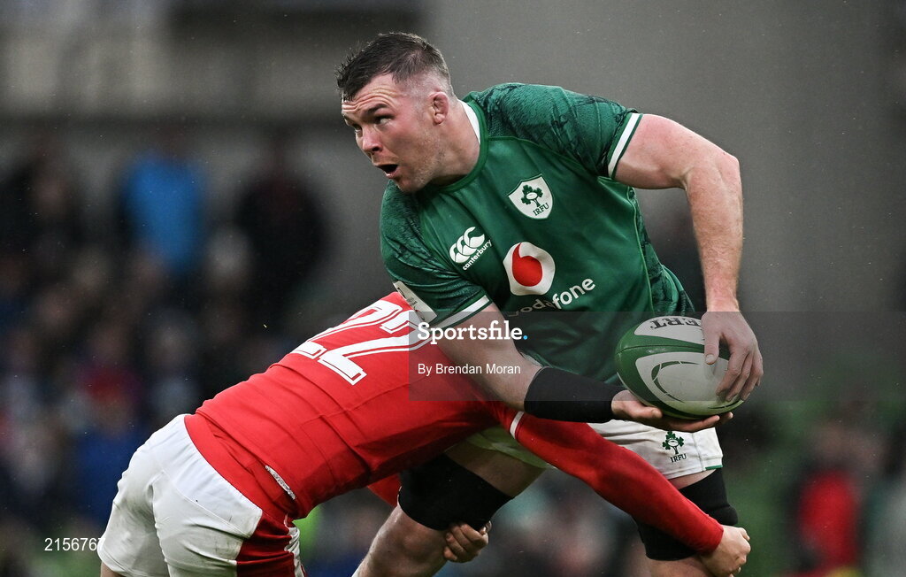5 February 2022; Peter O’Mahony of Ireland is tackled by Callum Sheedy of Wales during the Guinness Six Nations Rugby Championship match between Ireland and Wales at Aviva Stadium in Dublin. Photo by Brendan Moran/Sportsfile