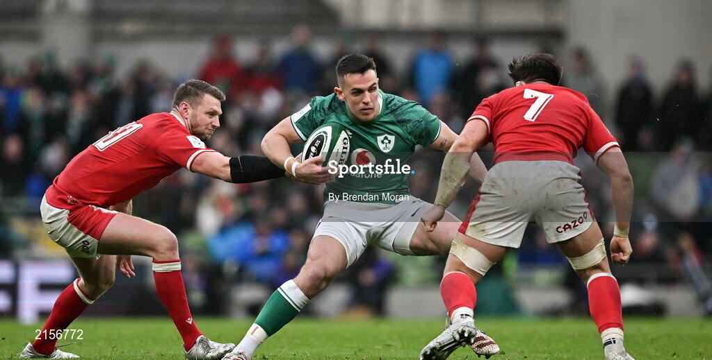 5 February 2022; James Hume of Ireland in action against Dan Biggar, left, and Taine Basham of Wales during the Guinness Six Nations Rugby Championship match between Ireland and Wales at Aviva Stadium in Dublin. Photo by Brendan Moran/Sportsfile