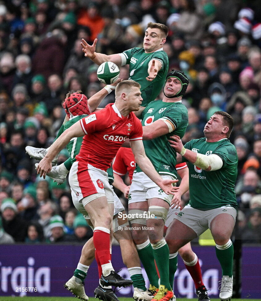 5 February 2022; Garry Ringrose of Ireland attempts to gain possession ahead of teammates Josh van der Flier, James Ryan and Tadhg Furlong and Johnny McNicholl of Wales during the Guinness Six Nations Rugby Championship match between Ireland and Wales at Aviva Stadium in Dublin. Photo by Brendan Moran/Sportsfile