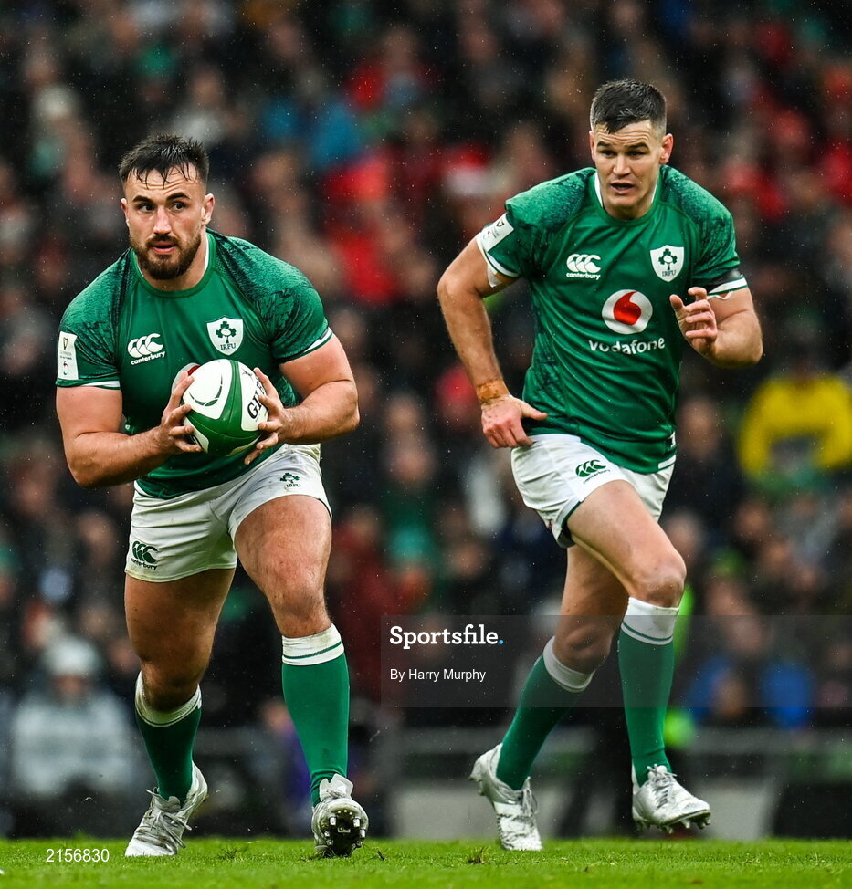 5 February 2022; Rónan Kelleher, left, and Jonathan Sexton of Ireland during the Guinness Six Nations Rugby Championship match between Ireland and Wales at the Aviva Stadium in Dublin. Photo by Harry Murphy/Sportsfile
