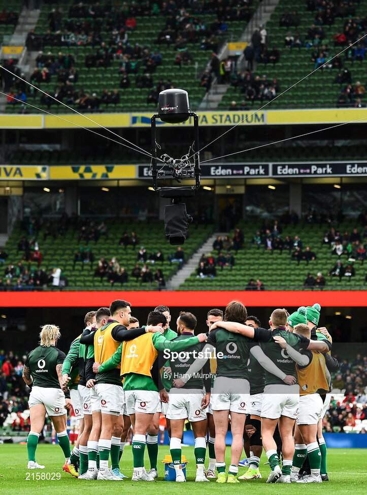 5 February 2022; Ireland players huddle watched by the Spidercam before the Guinness Six Nations Rugby Championship match between Ireland and Wales at the Aviva Stadium in Dublin. Photo by Harry Murphy/Sportsfile