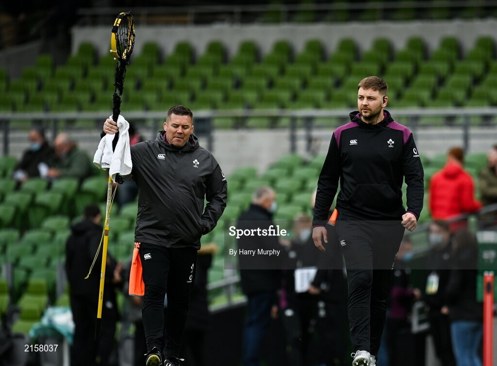 5 February 2022; Iain Henderson of Ireland, right, and Ireland national scrum coach John Fogarty during the Guinness Six Nations Rugby Championship match between Ireland and Wales at the Aviva Stadium in Dublin. Photo by Harry Murphy/Sportsfile