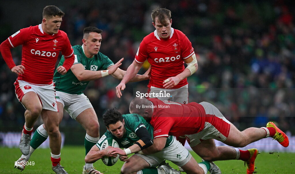 5 February 2022; Joey Carbery of Ireland is tackled by Dillon Lewis of Wales during the Guinness Six Nations Rugby Championship match between Ireland and Wales at Aviva Stadium in Dublin. Photo by Brendan Moran/Sportsfile