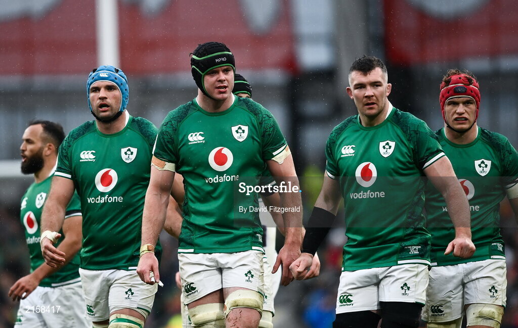 5 February 2022; Members of the Ireland pack, from left, Tadhg Beirne, James Ryan, Peter O’Mahony and Josh van der Flier during the Guinness Six Nations Rugby Championship match between Ireland and Wales at the Aviva Stadium in Dublin. Photo by David Fitzgerald/Sportsfile