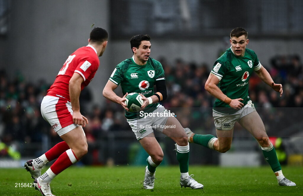 5 February 2022; Joey Carbery of Ireland supported by Garry Ringrose during the Guinness Six Nations Rugby Championship match between Ireland and Wales at the Aviva Stadium in Dublin. Photo by David Fitzgerald/Sportsfile