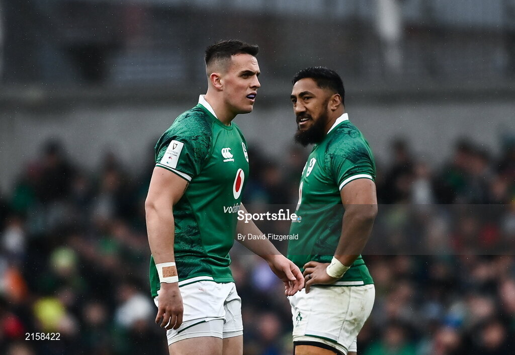 5 February 2022; James Hume, left, and Bundee Aki of Ireland during the Guinness Six Nations Rugby Championship match between Ireland and Wales at the Aviva Stadium in Dublin. Photo by David Fitzgerald/Sportsfile
