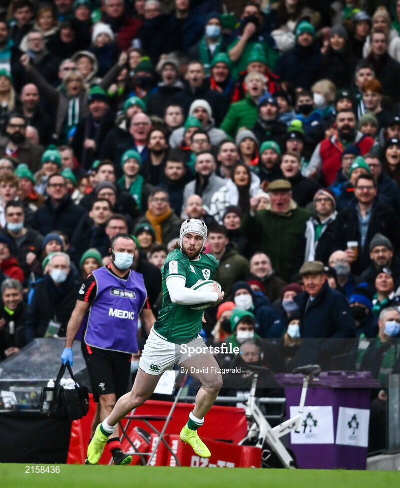 5 February 2022; Mack Hansen of Ireland during the Guinness Six Nations Rugby Championship match between Ireland and Wales at the Aviva Stadium in Dublin. Photo by David Fitzgerald/Sportsfile