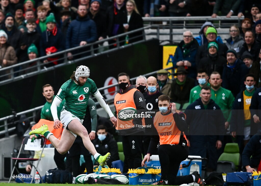 5 February 2022; Mack Hansen of Ireland during the Guinness Six Nations Rugby Championship match between Ireland and Wales at the Aviva Stadium in Dublin. Photo by David Fitzgerald/Sportsfile