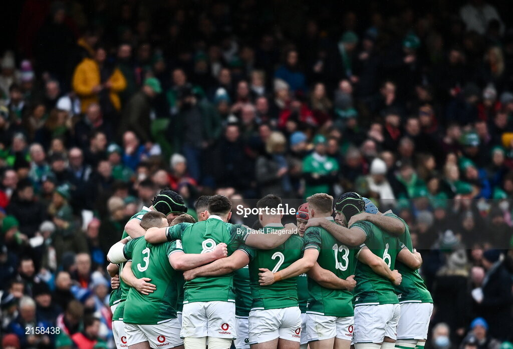 5 February 2022; Ireland players huddle before the Guinness Six Nations Rugby Championship match between Ireland and Wales at the Aviva Stadium in Dublin. Photo by David Fitzgerald/Sportsfile