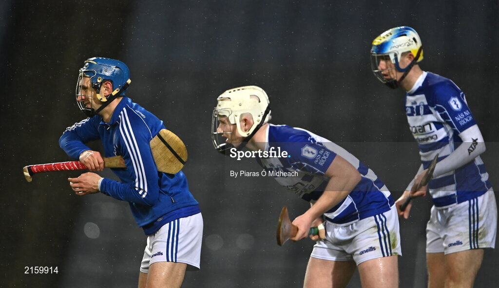 5 February 2022; Naas goalkeeper Cormac Gallagher tries to dry his hurl as he and teammates John McKeon and Cormac Daly, right, await a Kilmoyley free during the AIB GAA Hurling All-Ireland Intermediate Club Championship Final match between Kilmoyley, Kerry, and Naas, Kildare, at Croke Park in Dublin. Photo by Piaras Ó Mídheach/Sportsfile