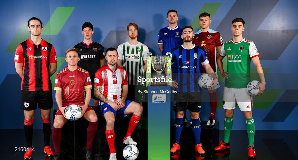 9 February 2022; SSE Airtricity League First Division players, from left, Sam Verdon of Longford Town, Conor McCormack of Galway United, Joe Manley of Wexford FC, Jack Brady of Treaty United, Hugh Douglas of Bray Wanderers, Eddie Nolan of Waterford, Derek Daly of Athlone Town, Beineon Whitmarsh O’Brien of Cobh Ramblers and Cian Coleman of Cork City at the launch of the SSE Airtricity Premier & First Division and Women's National League 2022 season held at at HBV Studios in Clarehall, Dublin. Photo by Stephen McCarthy/Sportsfile