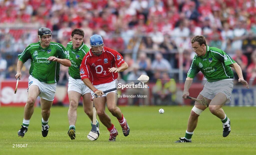 22 July 2006; Tom Kenny, Cork, in action against TJ Ryan, left, Barry Foley and Ollie Moran, right, Limerick. Guinness All-Ireland Senior Hurling Championship Quarter-Final, Cork v Limerick, Semple Stadium, Thurles, Co. Tipperary. Picture credit: Brendan Moran / SPORTSFILE