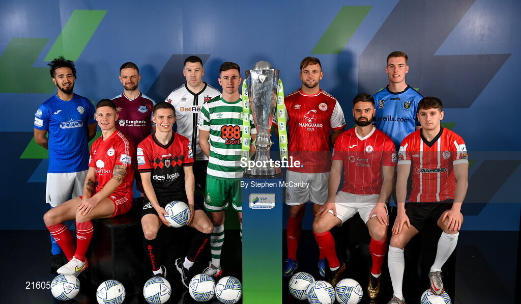 9 February 2022; SSE Airtricity League Premier Division players, from left, Bastien Hery of Finn Harps, Luke Byrne of Shelbourne, Dane Massey of Drogheda United, Tyreke Wilson of Bohemians, Brian Gartland of Dundalk, Ronan Finn of Shamrock Rovers, Paddy Barrett of St Patrick's Athletic, Greg Bolger of Sligo Rovers, Jack Keaney of UCD and Ronan Boyce of Derry City at the launch of the SSE Airtricity Premier & First Division and Women's National League 2022 season held at at HBV Studios in Clarehall, Dublin. Photo by Stephen McCarthy/Sportsfile