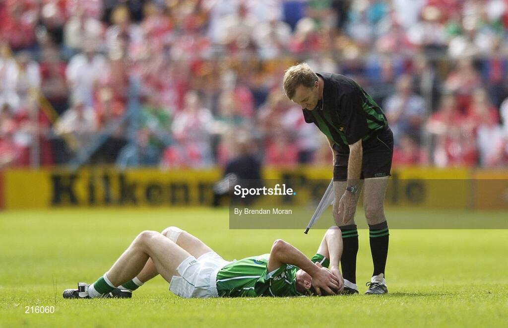 22 July 2006; Linesman Dickie Murphy checks on the welfare of Limerick's Ollie Moran. Guinness All-Ireland Senior Hurling Championship Quarter-Final, Cork v Limerick, Semple Stadium, Thurles, Co. Tipperary. Picture credit: Brendan Moran / SPORTSFILE
