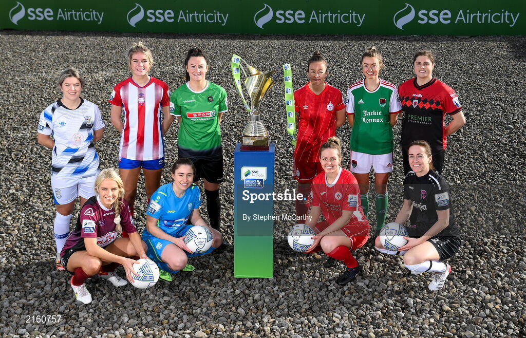9 February 2022; SSE Airtricity Women's National League players, front row, from left, Julie Ann Russell of Galway Women, Rachel Doyle of DLR Waves, Emma Hansberry of Sligo Rovers, Kylie Murphy of Wexford Youths Women, with, front row, Laurie Ryan of Athlone Town AFC, Jesse Mendez of Treaty United , Tiegan Ruddy of Peamount United, Pearl Slattery of Shelbourne, Danielle Burke of Cork City and Sinead Taylor of Bohemians at the launch of the SSE Airtricity Premier & First Division and Women's National League 2022 season held at at HBV Studios in Clarehall, Dublin. Photo by Stephen McCarthy/Sportsfile