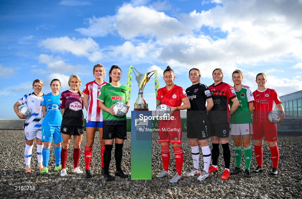 9 February 2022; SSE Airtricity Women's National League players, from left, Laurie Ryan of Athlone Town AFC, Rachel Doyle of DLR Waves, Julie Ann Russell of Galway Women, Jesse Mendez of Treaty United, Tiegan Ruddy of Peamount United, Pearl Slattery of Shelbourne, Kylie Murphy of Wexford Youths Women, Sinead Taylor of Bohemians, Danielle Burke of Cork City, Emma Hansberry of Sligo Rovers at the launch of the SSE Airtricity Premier & First Division and Women's National League 2022 season held at at HBV Studios in Clarehall, Dublin. Photo by Stephen McCarthy/Sportsfile