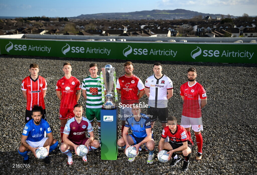 9 February 2022; SSE Airtricity League Premier Division players, front row, from left, Bastien Hery of Finn Harps, Dane Massey of Drogheda United, Jack Keaney of UCD and Sinead Taylor of Bohemians, with, back row, Ronan Boyce of Derry City, Luke Byrne of Shelbourne, Ronan Finn of Shamrock Rovers, Paddy Barrett of St Patrick's Athletic, Brian Gartland of Dundalk and Greg Bolger of Sligo Rovers at the launch of the SSE Airtricity Premier & First Division and Women's National League 2022 season held at at HBV Studios in Clarehall, Dublin. Photo by Stephen McCarthy/Sportsfile