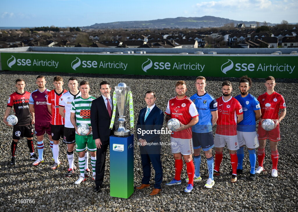 9 February 2022; David Manning, Director of Customer Marketing, SSE Airtricity, left, and Mark Scanlon, League of Ireland director, with SSE Airtricity League Premier Division players, from left, Tyreke Wilson of Bohemians, Dane Massey of Drogheda United, Ronan Boyce of Derry City, Brian Gartland of Dundalk, Ronan Finn of Shamrock Rovers, Paddy Barrett of St Patrick's Athletic, Jack Keaney of UCD, Greg Bolger of Sligo Rovers, Bastien Hery of Finn Harps and Luke Byrne of Shelbourne at the launch of the SSE Airtricity Premier & First Division and Women's National League 2022 season held at at HBV Studios in Clarehall, Dublin. Photo by Stephen McCarthy/Sportsfile