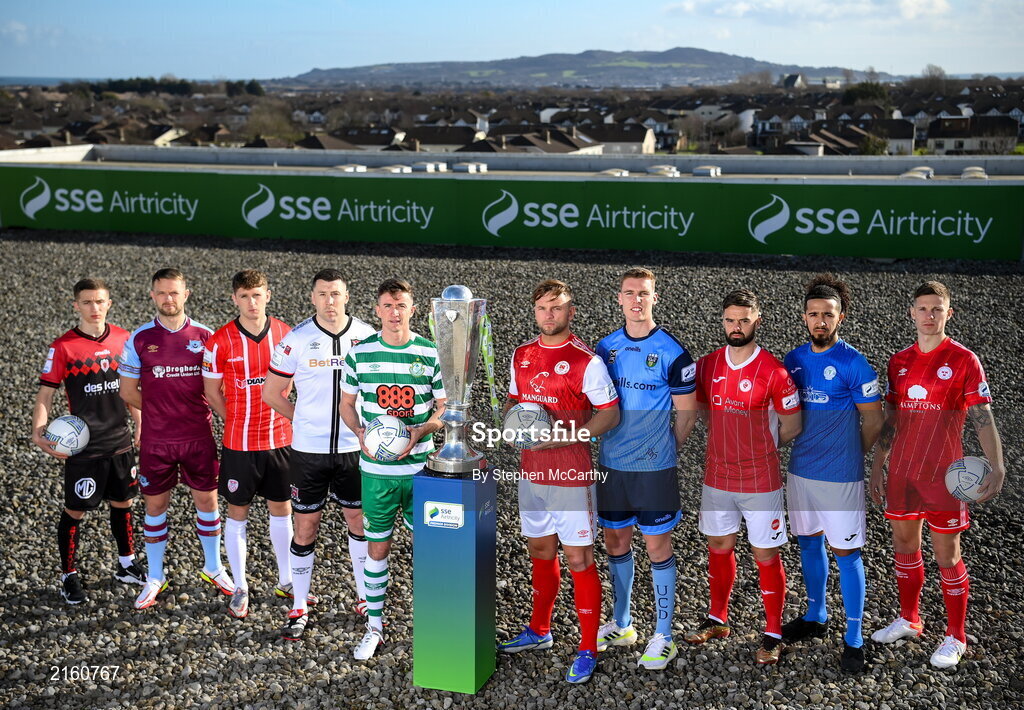9 February 2022; SSE Airtricity League Premier Division players, from left, Tyreke Wilson of Bohemians, Dane Massey of Drogheda United, Ronan Boyce of Derry City, Brian Gartland of Dundalk, Ronan Finn of Shamrock Rovers, Paddy Barrett of St Patrick's Athletic, Jack Keaney of UCD, Greg Bolger of Sligo Rovers, Bastien Hery of Finn Harps and Luke Byrne of Shelbourne at the launch of the SSE Airtricity Premier & First Division and Women's National League 2022 season held at at HBV Studios in Clarehall, Dublin. Photo by Stephen McCarthy/Sportsfile